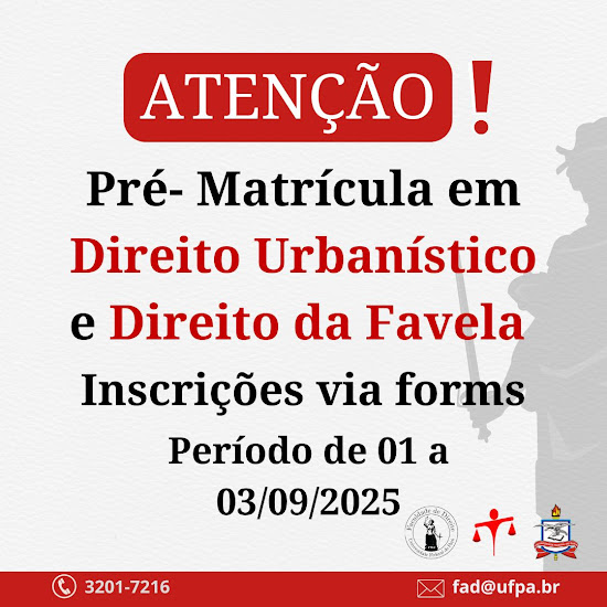 2025.3 - PRÉ-MATRICULA EM DIREITO DA FAVELA Para realizar a pré maticula, clique aqui. 2025.3 - PRÉ-MATRICULA EM DIREITO URBANISTICO Para realizar a pré matricula, clique aqui.