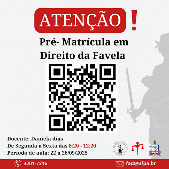 2025.3 - PRÉ-MATRICULA EM DIREITO DA FAVELA Para realizar a pré-maticula, clique aqui ou escaneie o QR code.